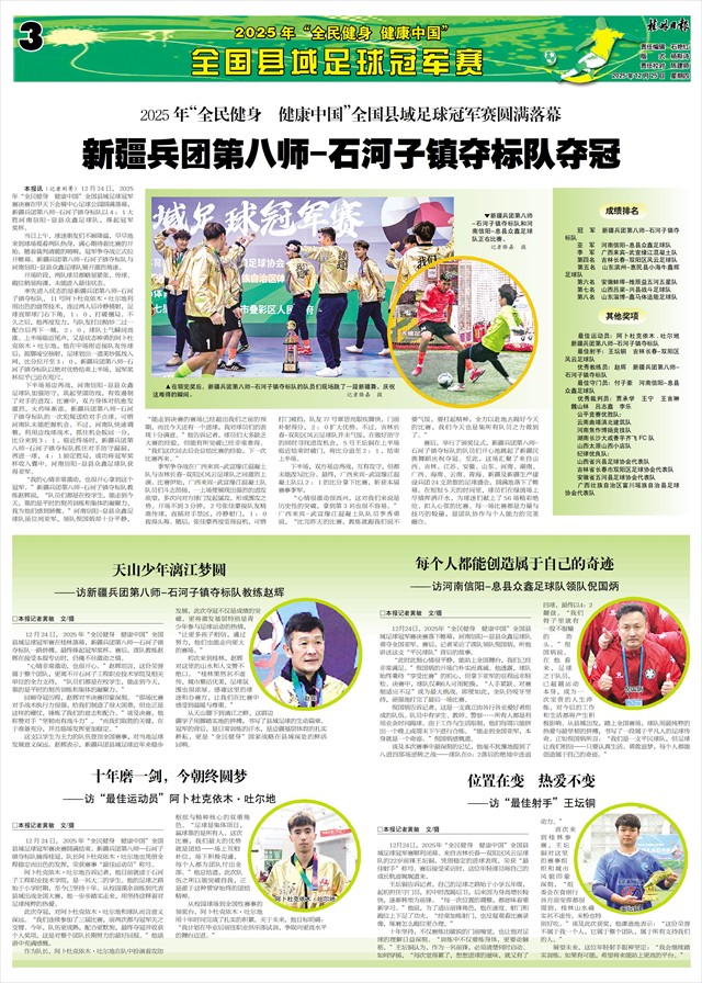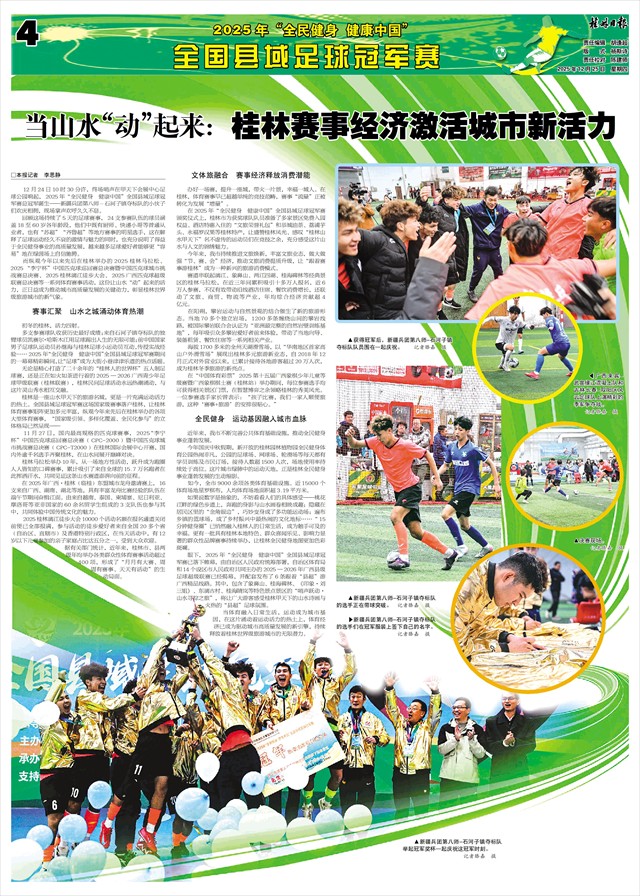 本报讯(记者李思静)12月24日,备受瞩目的2025年“全民健身 健康中国”全国县域足球冠军赛在桂林顺利结束全部赛程。在最终的冠军争夺战中,新疆兵团第八师-石河子镇夺标队以4∶1战胜河南信阳-息县众鑫足球队,成功捧起冠军奖杯,河南信阳-息县众鑫足球队与广西来宾-武宣缘江混凝土队分别获得亚军和季军。中国足球发展基金会社会足球发展部部长周毅、自治区体育局副局长林凌云、桂林市副市长杨莎莎出席闭幕活动并颁奖。