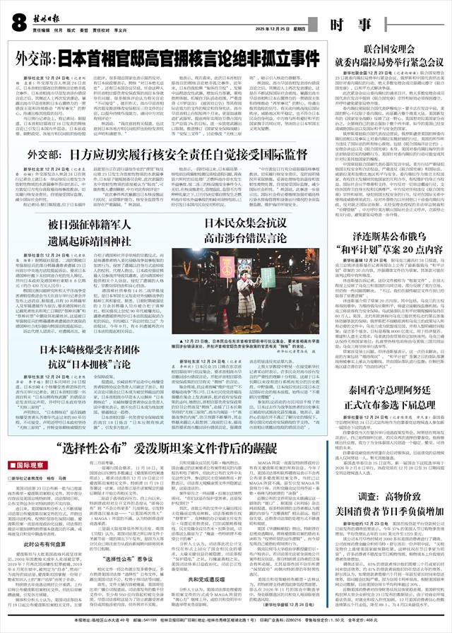 新华社北京12月24日电(记者刘杨 袁睿)外交部发言人林剑24日表示,日本首相官邸高官的拥核言论绝非孤立事件。日本首相高市早苗发表涉台错误言论之后,其侧近人士再次发表谬论,暴露出高市早苗首相和日本右翼势力的一贯错误主张和持续推动“再军事化”的野心,传递出极其危险的信号。