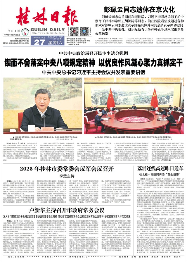 2025年桂林市委常委会议军会议召开 李楚主持   本报讯(记者刘健)12月25日,市委书记、桂林警备区党委第一书记李楚主持召开桂林市委常委会议军会议,深入学习贯彻党的二十届四中全会精神和习近平强军思想,认真落实自治区党委常委会议军会议部署要求,听取全市国防动员和后备力量建设情况汇报,研究部署下步工作。