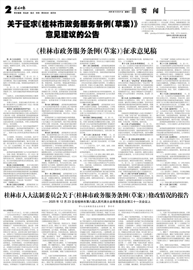 意见建议的公告   《桂林市政务服务条例(草案)》已于2025年12月23日经市六届人大常委会第三十一次会议第二次审议,根据新修改的《桂林市地方性法规制定条例》的规定,现将法规草案全文及修改情况的报告予以公布,公开征求意见。提出意见建议的,请于2026年1月26日前将有关意见建议通过传真或者发送邮箱,反馈至市人大常委会法工委。