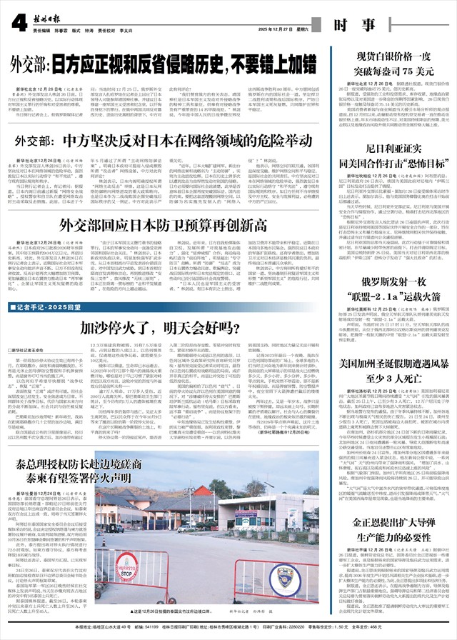外交部回应日本防卫预算再创新高   新华社北京12月26日电(记者刘杨 冯歆然)日本政府26日批准2026财年预算案,其中防卫预算约9.04万亿日元,再创历史新高。对此,外交部发言人林剑26日在例行记者会上表示,近期国际社会对日本军事安全动向批评声音不断,日方不但没有反省收敛,反而计划再次大幅增加防卫预算,更加暴露出日本右翼势力推动日本“再军事化”、企图让军国主义死灰复燃的险恶用心。