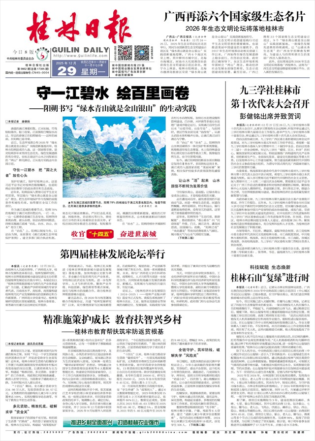 广西云-广西日报讯(记者余锋 通讯员杜洋 韦善康)12月24—25日,2025年生态文明论坛在北京举行,其间为全国新晋生态文明建设示范区及“绿水青山就是金山银山”实践创新基地授牌,广西6个地区光荣上榜,其中柳州市城中区、北海市海城区、河池市大化瑶族自治县获得生态文明建设示范区命名,南宁市上林县、桂林市阳朔县、北海市涠洲岛旅游区荣获“绿水青山就是金山银山”实践创新基地称号。