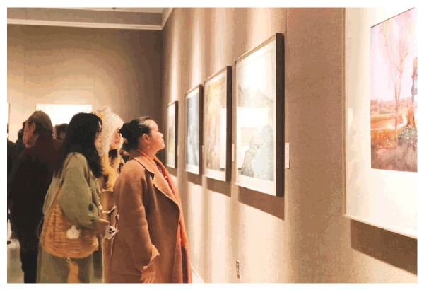 ▲首届“漓·韵”——桂林水彩画双年展上,观众被一幅幅精美的水彩画吸引。 记者韦莎妮娜 摄