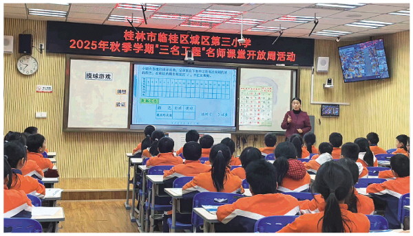 近日,桂林市临桂区城区第三小学举办“三名工程”名师课堂开放周活动。活动涵盖语、数、英等六门学科,以“线下观摩+线上直播”形式展示,吸引教师及家长代表参与。授课教师紧扣学科核心素养,注重学科融合与课堂生成,发挥名师示范引领作用。活动旨在加强校际教学交流与资源共享,搭建家校共育平台,为学生发展和教师成长赋能。 (朱晓琴/文 赵芷一/摄)