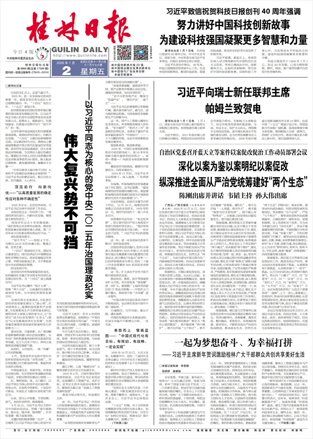 “新年贺词中关于科技创新的论述让我倍感振奋、备受鼓舞。过去一年,我国新质生产力稳步发展、科技成就硕果累累,让桂林科技工作者更加坚定了前行信心。”市科技局党组书记、局长曹方明表示,近年来,桂林坚持“科创赋能强产业”,加速高质量“科创桂林”建设,诞生了国产民航轮胎等多项标志性新产品,培育壮大了一批国家级科技领军企业、瞪羚企业。新的一年,我们将以贺词精神为指引,以实干笃定前行,将高质量“科创桂林”建设作为关键突破口,(下转第二版)