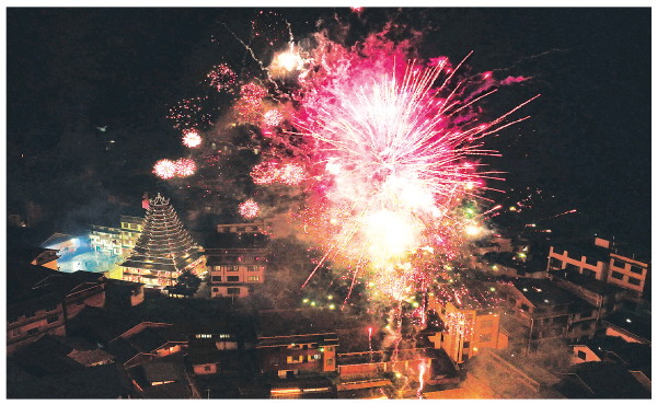 在村口的侗族鼓楼旁,村民和游客共同观看了烟花秀。缤纷的烟花照亮了侗寨的传统建筑和街巷,现场洋溢着欢乐的节日气氛。 记者李忠波 摄
