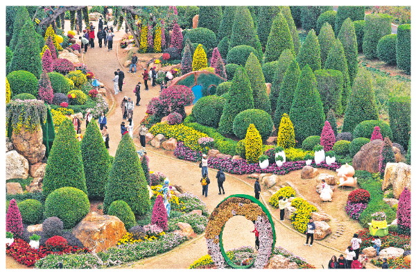 1月3日,游客在广西南宁市青秀山风景区观赏菊花(无人机照片)。元旦小长假期间,人们用各种各样的方式放松休闲,乐享假期。