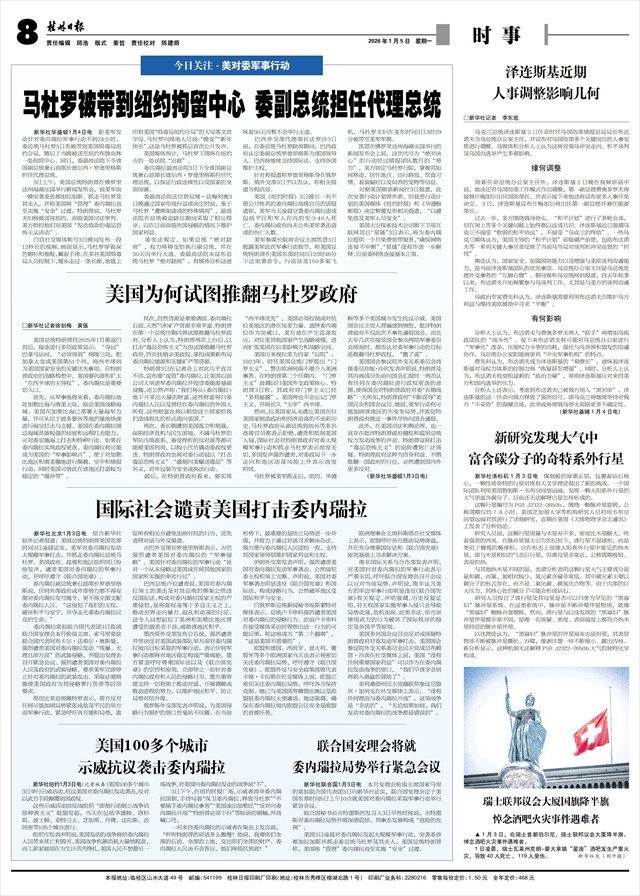 国际社会谴责美国打击委内瑞拉   新华社北京1月3日电 综合新华社驻外记者报道:美国总统特朗普美国东部时间3日凌晨证实,美军对委内瑞拉发动大规模军事打击,并抓走委内瑞拉总统马杜罗。多国政府、政要和地区组织同日纷纷发声,谴责美国对委内瑞拉的军事行动,并呼吁遵守《联合国宪章》。
