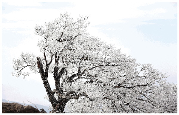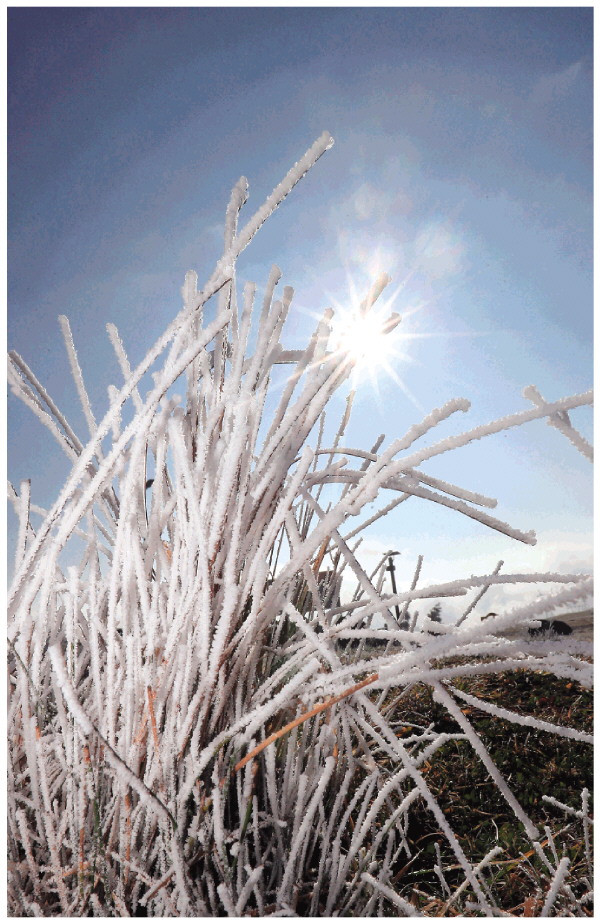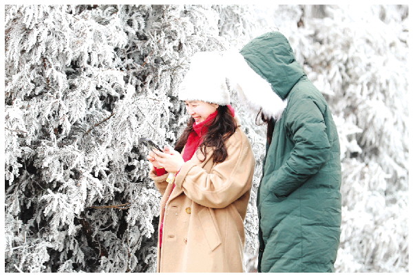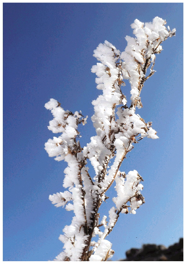 当天下午,寒意刺骨却挡不住人们追寻冰雪奇景的热情。记者循着游客的足迹登上高海拔观景区域,眼前的景致依旧动人:树木、草甸与藤蔓仍被晶莹的冰霜包裹,枝头缀满簇簇形态各异的雾凇,如银菊绽放,似玉簪低垂,在午后阳光下流转着剔透的光泽。放眼望去,近处松针凝冰如剑,直指天空;远处阔叶枝头挂满茸茸冰穗,微风拂过,冰晶簌簌飘落,宛若梦境。与连日来漫山遍野的银装素裹相比,此刻的雾凇更显珍贵——它静静点缀在高处,与下方已渐露青黛的山体形成层次分明的别样景观。