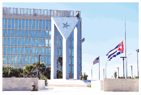 1月5日,在古巴首都哈瓦那,美国驻古巴大使馆前的古巴国旗降至旗杆中间。古巴国家主席迪亚斯-卡内尔4日宣布,为在美国对委内瑞拉实施军事行动过程中牺牲的32名古巴公民举行全国哀悼。 新华社发