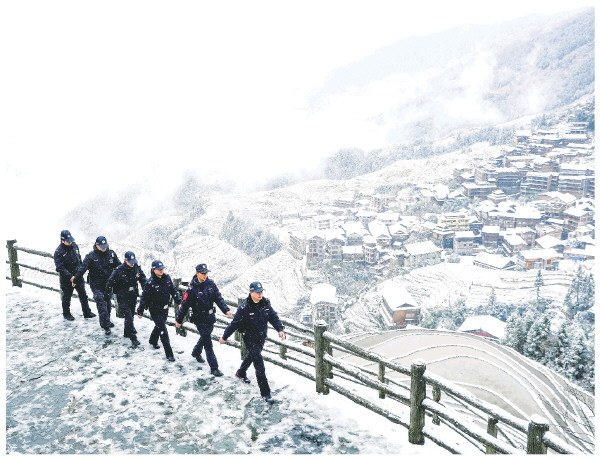 ▲冬季,桂林公安民警在银装素裹的龙脊梯田景区巡逻。 通讯员吴倩茜 摄