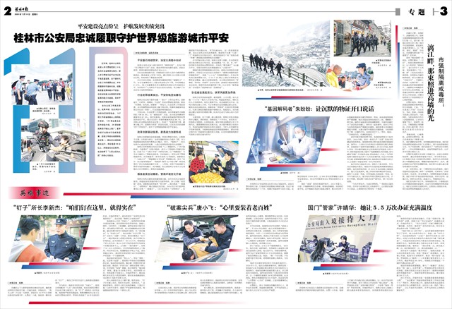平安建设亮点纷呈 护航发展实绩突出 桂林市公安局忠诚履职守护世界级旅游城市平安   近年来,桂林市公安机关深入学习贯彻党的二十大及历次全会精神为指引,深入学习贯彻习近平总书记关于高质量发展、关于新时代公安工作的重要论述,牢牢把握新时代使命任务,统筹高质量发展和高水平安全,在法治轨道上全面提升护航发展的能力与效能,筑牢平安稳定的坚实根基