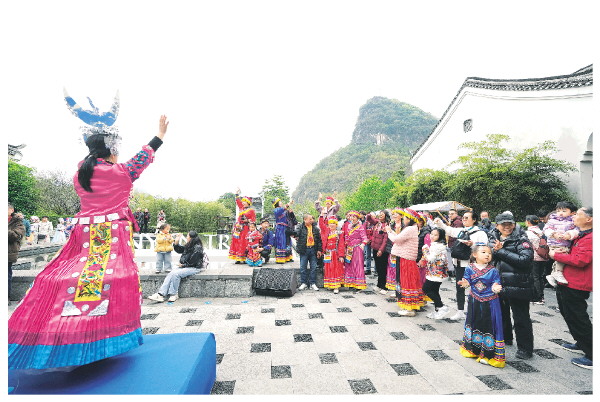 ▲2025年3月31日,“情系大湾区·踏歌山水间”深圳桂林文旅互动主题活动在阳朔悦榕庄启动。活动宣布,为回馈粤桂协作帮扶城市深圳,2025年桂林60家A级旅游景区面向深圳户籍居民开展免首道门票政策及相关配套服务活动。图为在阳朔悦榕庄酒店,深圳游客换上少数民族服装,与桂林的“刘三姐”“阿牛哥”对唱山歌。 (资料图片)