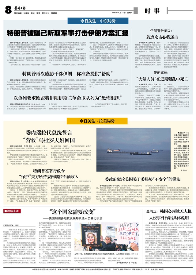 特朗普被曝已听取军事打击伊朗方案汇报   新华社华盛顿1月10日电 美国《纽约时报》10日援引匿名美国官员的话报道称,美国总统特朗普近日已听取关于军事打击伊朗方案的汇报。