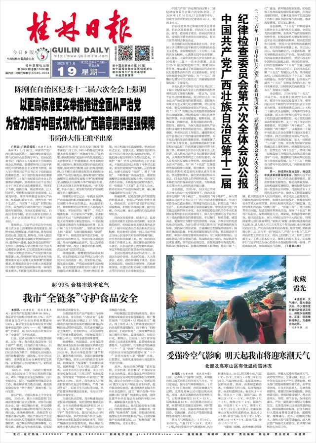 纪律检查委员会第六次全体会议公报 (二○二六年一月十七日中国共产党广西壮族自治区第十二届纪律检查委员会第六次全体会议通过)   中国共产党广西壮族自治区第十二届纪律检查委员会第六次全体会议,于2026年1月16日至17日在南宁举行。出席全会的有自治区纪委委员40人,列席346人。