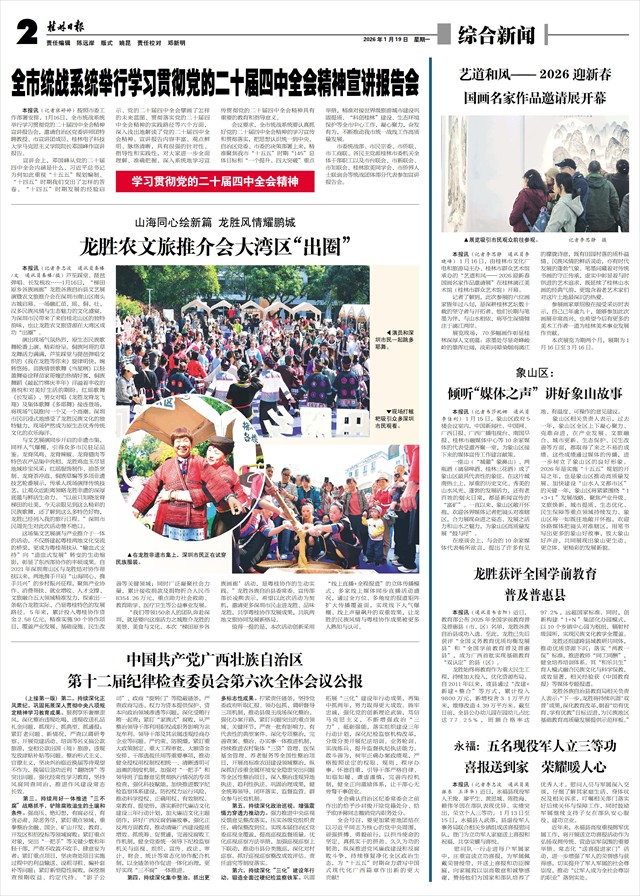 山海同心绘新篇 龙胜风情耀鹏城 龙胜农文旅推介会大湾区“出圈”   本报讯(记者李忠波 通讯员秦榛/文 通讯员秦榛/摄)芦笙踩堂、琵琶弹唱、长发梳妆……1月16日,“梯田原乡各族画廊”龙胜各族自治县文艺展演暨农文旅推介会在深圳市南山区南头古城启幕。一场融汇苗、瑶、侗、壮、汉多民族风情与生态魅力的文化盛宴,为深圳市民带来了来自桂北山区的独特韵味,也让龙胜农文旅资源在大湾区成功“出圈”。