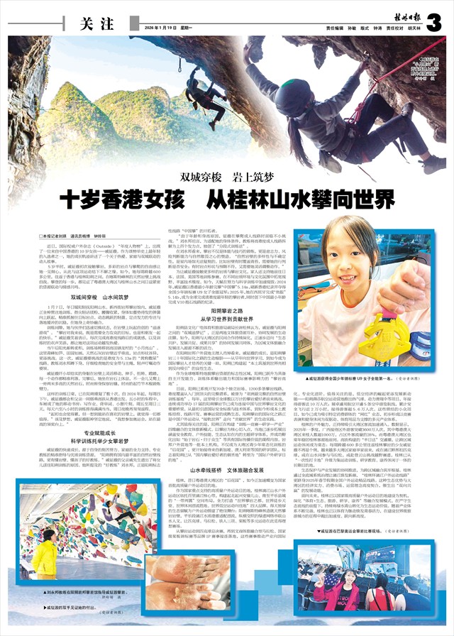双城穿梭 岩上筑梦 十岁香港女孩 从桂林山水攀向世界   □本报记者刘琪 通讯员杨博 钟玲丽