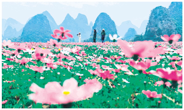 1月19日,在临桂区四塘镇田心村,利用300亩冬闲田种植的格桑花陆续绽放,粉白相间的花朵层层叠叠,与远处喀斯特地貌的峰林相映成趣,美不胜收,吸引了众多市民游客前往观赏、拍照。