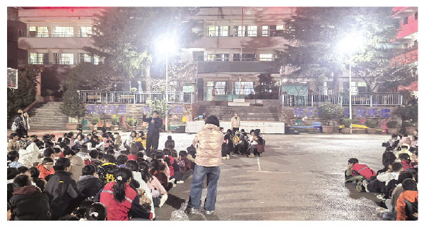 1月19日,巧家县老店中学师生在地震发生后撤离到操场避险。 新华社发