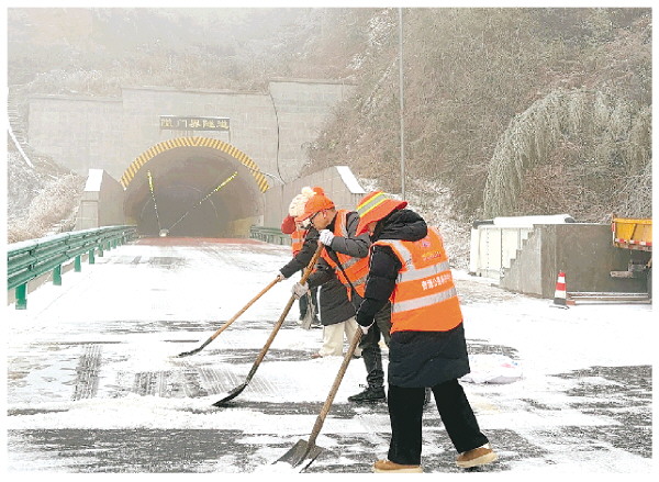 资源公路养护中心工作人员在省道301线资源隘门界路段开展除冰抢险作业。 通讯员蔡桂玉 摄