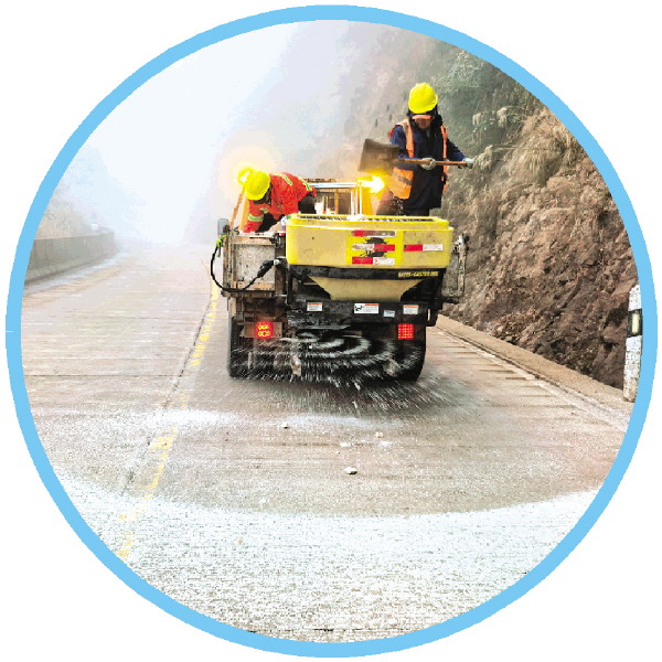 抢险人员在现场设置警示标志引导过往车辆,同时调配融雪车进行融雪剂撒布作业,同步启用自动喷淋融雪剂智能系统,形成“智能喷淋+机械抛撒+人工铲冰”的高效除冰组合拳,及时清除路面冰雪。与此同时,增派巡查力量,对桥面、弯道等易结冰风险点进行拉网式排查,实时掌握道路通行状况,确保除冰作业与隐患排查同步推进,以最快速度恢复道路通行。