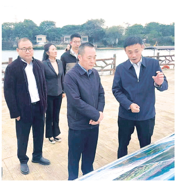 赵家维(右二)带队到漓投公司调研,对桂林漓江(南洲大桥-净瓶山桥段)洲岛及沿岸生态修复项目涉及的蚂蟥洲、大小洲,以及环象山水系生态修复及配套产业提升工程项目进行实地考察调研。