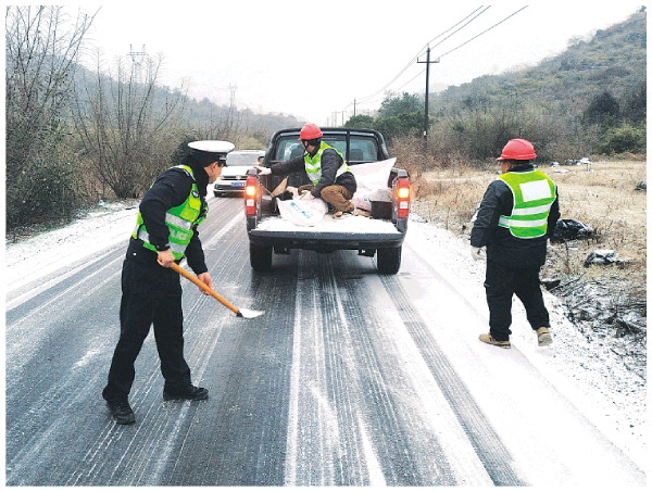 1月21日,全州县公安局交管大队民警在结冰路段开展撒盐除冰工作。(桂林市公安局供图)