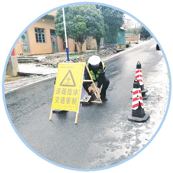 1月21日,全州县公安局交管大队民警在结冰路段设置警示牌。(桂林市公安局供图)