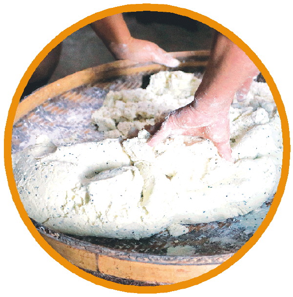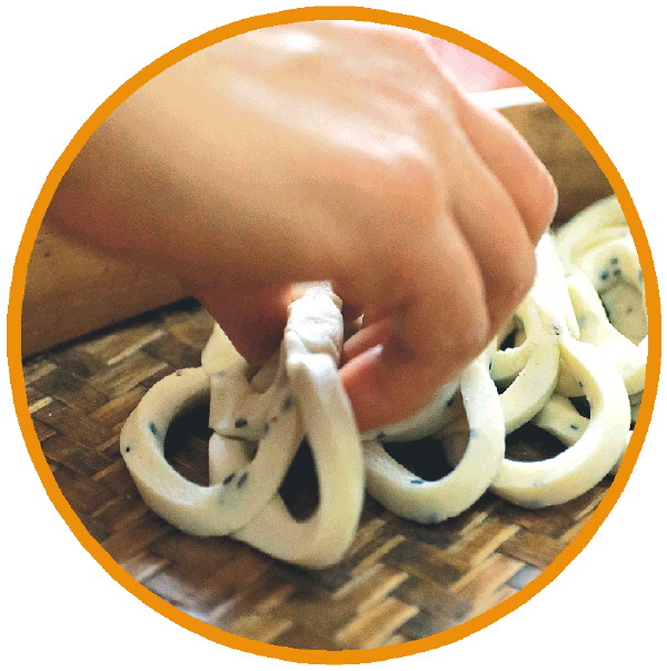 熬煮面团、熬制糖浆的工序完成后,莲花绞的和面环节便开始了。取一个大簸箕,将细腻的糯米粉倒入其中,在中间挖上一个小洞,依次放入煮好的面团、白糖糖浆和黑芝麻,将所有材料充分混合后,反复大力揉制,直到面团变成温润的乳白色,触感微微黏手便恰到好处。“面团要揉得劲道,做出来的莲花绞才好吃,一般都是我老公来做这一步,他手上的力度把控得比较好。”李雄花笑着说,夫妻俩多年的默契,在一碗面团的揉制中体现得淋漓尽致。