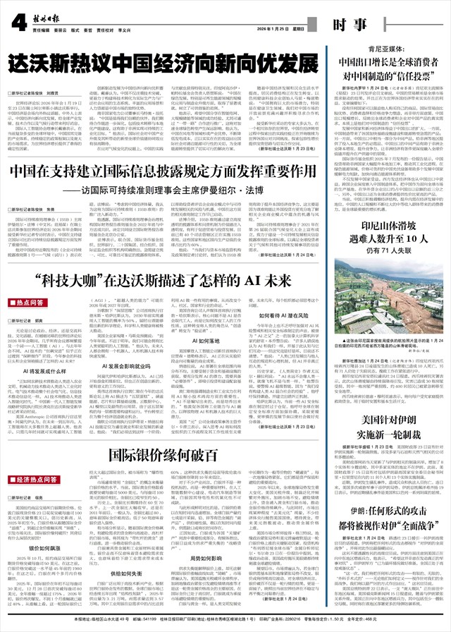 世界经济论坛2026年年会1月19日至23日在瑞士阿尔卑斯小镇达沃斯举行,中国经济是会场内外热议话题。中外人士表示,中国经济向新向优发展,给全球产业发展、技术合作以及气候行动带来利好消息。