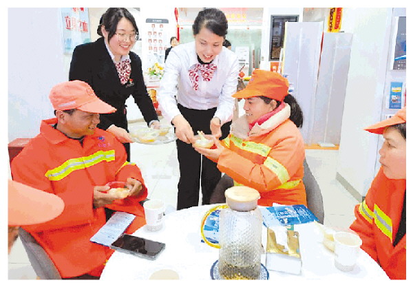 工行桂林分行辖内营业网点在元宵节开展“工行驿站”暖心活动,为环卫工人送上汤圆和祝福。