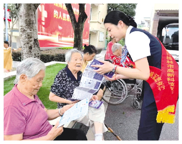 工行桂林分行组织青年员工开展志愿服务活动,向老人宣传反诈知识。