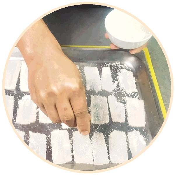 腌制好的肥肉片卷入豆沙制成初坯。