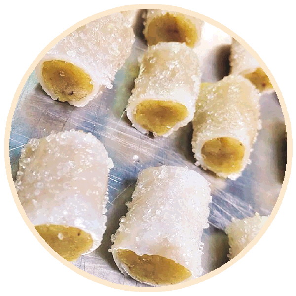 谢兴介绍,玻璃扣的制作需历经四道核心工序,每一步都暗藏匠心。首先将绿豆浸泡一晚,大火煮至脱壳,滤出水分,炒制成豆沙并加糖调味;随后将豆沙捏成直径约2厘米的圆柱形;接着把肥肉切片腌制24小时,卷入豆沙制成初坯;最后裹上鸡蛋面粉脆浆糊,放入热油锅中先炸至定型,再复炸至金黄色捞出。而在这看似固定的流程中,藏着他多年摸索的创新与坚守。