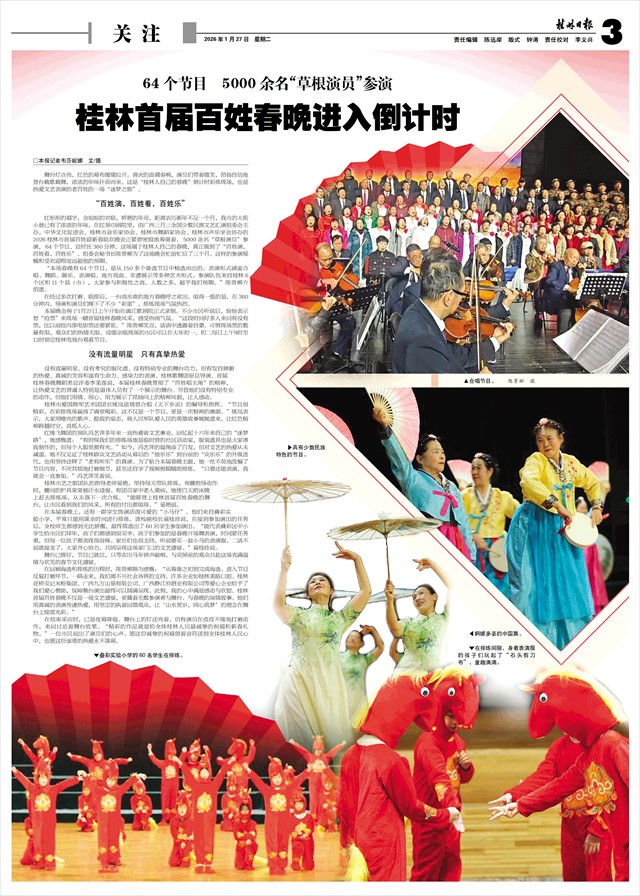 红彤彤的福字,金灿灿的对联,娇艳的年花,距离农历新年不足一个月,我市的大街小巷已有了浓浓的年味。在红领巾剧院里,由广西三月三全国少数民族文艺汇演组委会主办,中华文化促进会、桂林市音乐家协会、桂林市舞蹈家协会、桂林市声乐学会协办的2026桂林市首届百姓迎新春联欢晚会正紧锣密鼓地筹备着。5000余名“草根演员”参演,64个节目、总时长380分钟,这场属于桂林人自己的春晚,真正做到了“百姓演,百姓看,百姓乐”。组委会秘书长陈贵郴为了这场晚会忙前忙后了三个月。这样的参演规模和受欢迎程度远超他的预期。