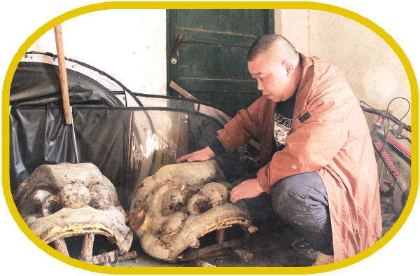 朱远惠展示“传家宝”——两尊水泥狮头模具。