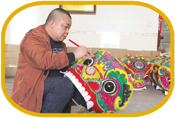 日前,记者走进位于恭城瑶族自治县西岭镇圩市街的鸿艺龙狮工艺店。时值下午,冬日的暖阳洒在满屋的狮头龙灯上,映照出一片绚烂而威严的光晕。青狮怒目、红狮昂扬、彩龙蜿蜒,空气中弥漫着纸浆与颜料的独特气息。店主朱远惠正屏息凝神,手持特制的沥粉工具,为一尊已具雏形的狮头勾勒最后的关键纹路。他的动作沉稳而流畅,一条饱满圆润、立体如生的线条随即浮现,仿佛为这瑞兽注入了最后一缕精魂。