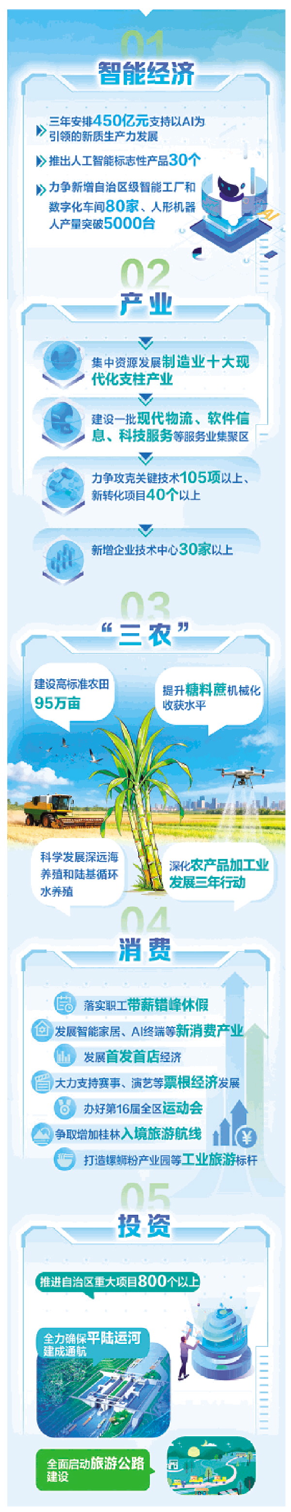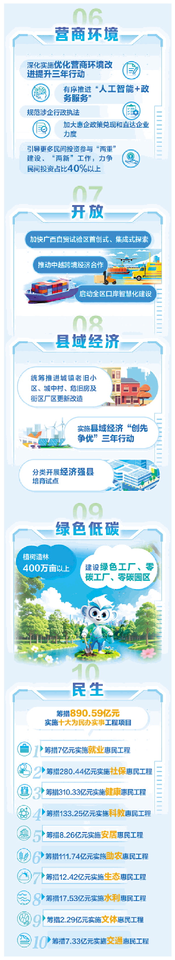 广西经济社会发展主要预期目标:经济增长5%左右,城镇调查失业率5.5%左右,居民消费价格指数涨幅2%以内,居民人均可支配收入和经济增长同步,实现“十五五”良好开局。