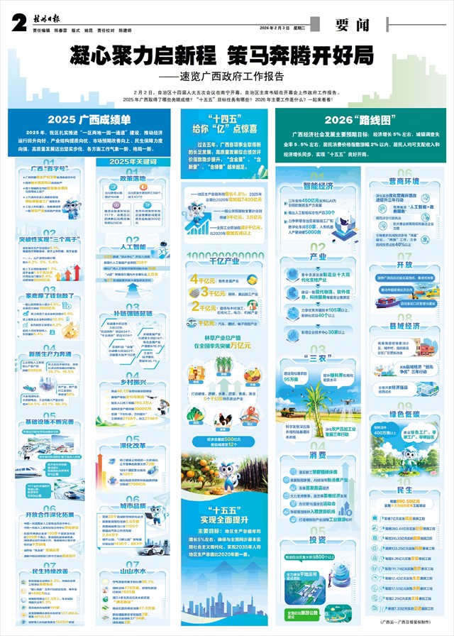 凝心聚力启新程 策马奔腾开好局 ——速览广西政府工作报告   2月2日,自治区十四届人大五次会议在南宁开幕,自治区主席韦韬在开幕会上作政府工作报告。2025年广西取得了哪些亮眼成绩?“十五五”目标任务有哪些?2026年主要工作是什么?一起来看看!