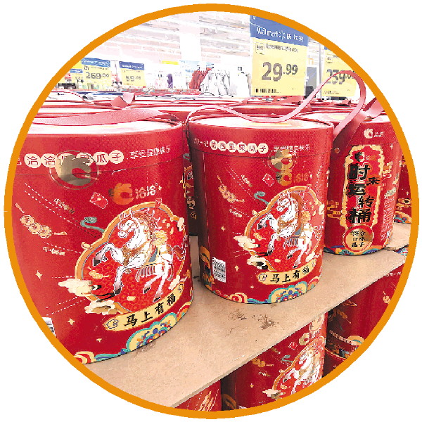 一米高的“马上发财桶”、既能吃又能玩的“如意上上签”饼干、跟春联一样长的巧克力五连包……网络上,这些创意年货卖得十分火爆。在实体市场里,精心设计的潮趣零食、动漫联名礼盒、精品水果等高颜值且兼具仪式感的商品,成为年轻人的“心头好”。
