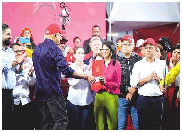 1月29日,在委内瑞拉首都加拉加斯,委内瑞拉全国代表大会主席豪尔赫·罗德里格斯(前左)向委内瑞拉代总统德尔西·罗德里格斯(前右)提交石油法改革相关法案。 新华社发