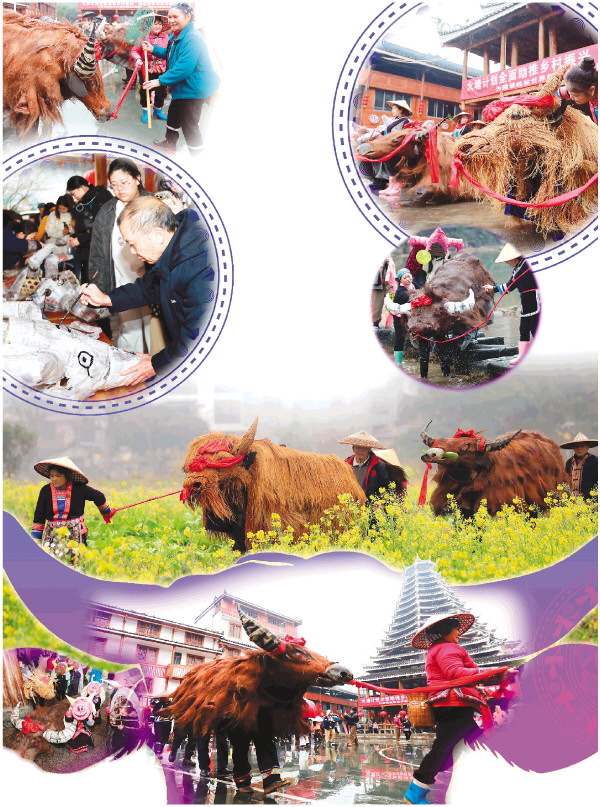 上午10时,急促的锣鼓声响起,活动进入高潮。三头扎制精巧的大“春牛”率先登场,10多头小“春牛”紧随其后,在村民操控下活灵活现。70多岁的侗族老艺人蒙超高声领唱:“立春到,春牛闹,五谷丰登生活好!”歌声划破雨雾,一旁扶犁耙、执牛鞭的村民应声而和,踏着鼓点起舞,“春牛”模拟耕田、欢跃等动作,既再现传统农耕场景,也传递出新时代侗家人的幸福喜悦。