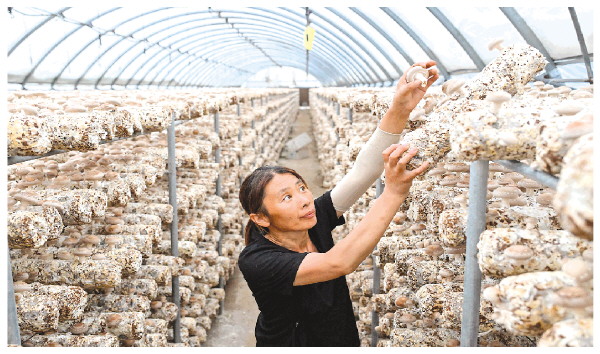 2025年7月4日,河北省阜平县天生桥镇食用菌产业核心园区的工作人员在大棚内摘香菇。 新华社记者李鑫 摄