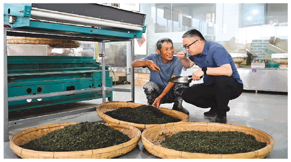 2025年5月25日,在山东省日照市五莲县丁家楼子村,第一书记郑勇山(右)在村里的茶叶合作社查看茶叶品质。 新华社记者马宁 摄