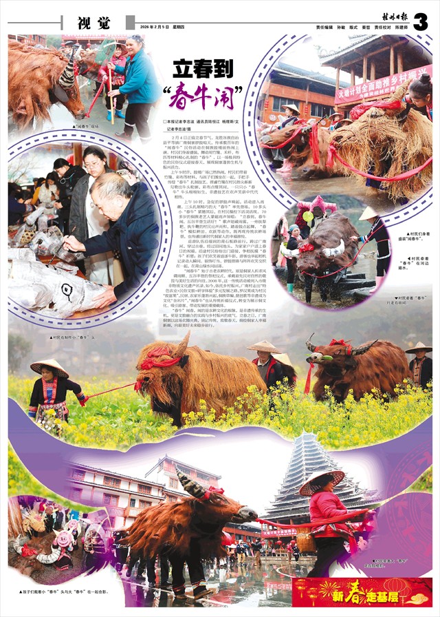 2月4日正值立春节气。龙胜各族自治县平等镇广南侗寨锣鼓喧天,传承数百年的“闹春牛”民俗活动在侗族鼓楼前热闹上演。村民们身着盛装,舞动用竹篾、禾秆、布匹等材料精心扎制的“春牛”,以一场极具特色的民俗仪式迎接春天,展现侗寨蓬勃生机与振兴活力。