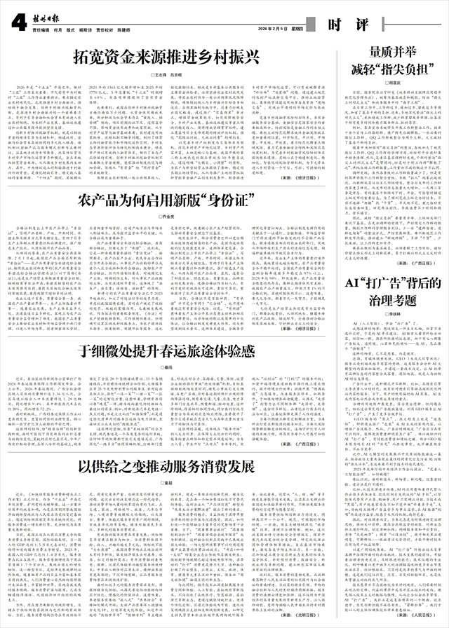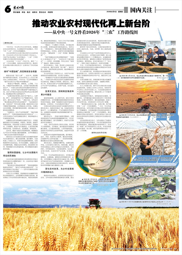 2026年是“十五五”开局之年,做好“三农”工作至关重要。不久前党中央对做好“三农”工作作出重要指示,要求锚定农业农村现代化,扎实推进乡村全面振兴,推动城乡融合发展。创新乡村振兴投融资机制,是推进乡村全面振兴的一个重要着力点,有利于引导金融和社会资本有效进入农业农村领域,为农村产业发展、基础设施建设和公共服务提升提供坚实支撑。