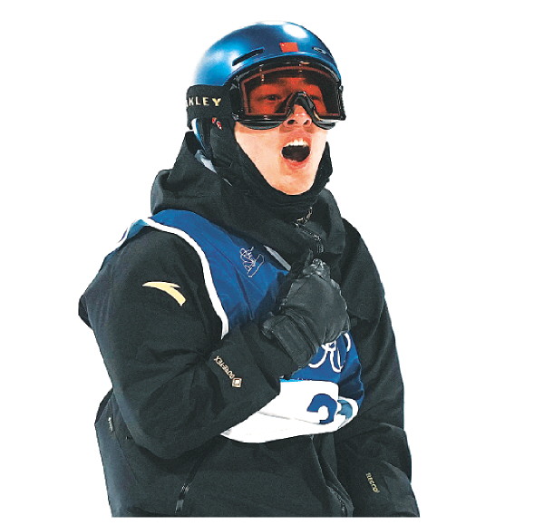 ▲2月5日,苏翊鸣在第三跳后庆祝。