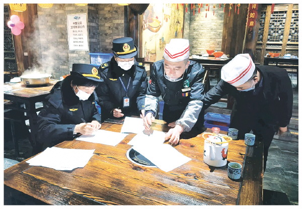 ▲市场监管人员与餐饮经营者签订《承接年夜饭食品安全承诺书》。