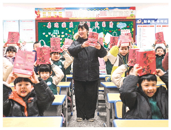 近日,桂林各小学纷纷开展散学活动。在桂林市民主小学各班级,老师准备了各种不同的“福袋”,里面既有学习用品,也有一些小礼物,在本学期最后一节课上送给学生,并提前祝福他们新年快乐。图为学生收到“福袋”后和老师一起合影。 记者滕嘉 摄