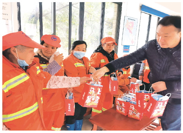 工作人员为环卫工人送上节日慰问品。 (市城管委供图)